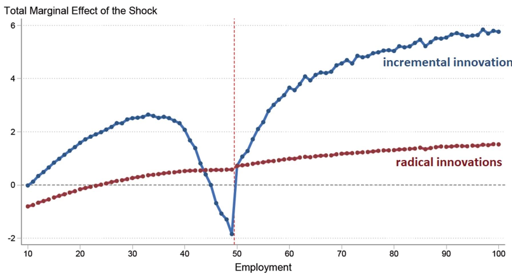 Our model also predicts that firms will respond very differently to demand shocks. Exogenous increases in demand (coming from an expansion in firms’ export markets, for example) will tend to raise R&D investments as firms’ rents from innovating increase accordingly. However, firms to the left of the regulatory threshold will respond much less, as they will gain less from innovation due to the regulation. This impact will be particularly strong for incremental innovations rather than radical innovations. The intuition is that if a company wants to innovate and pay the regulatory cost of moving beyond the 50 employee threshold, it may as well “go large” and swing for the fence. Moving slightly, say from 49 to 51 employees, is unlikely to make the R&D cost worthwhile.