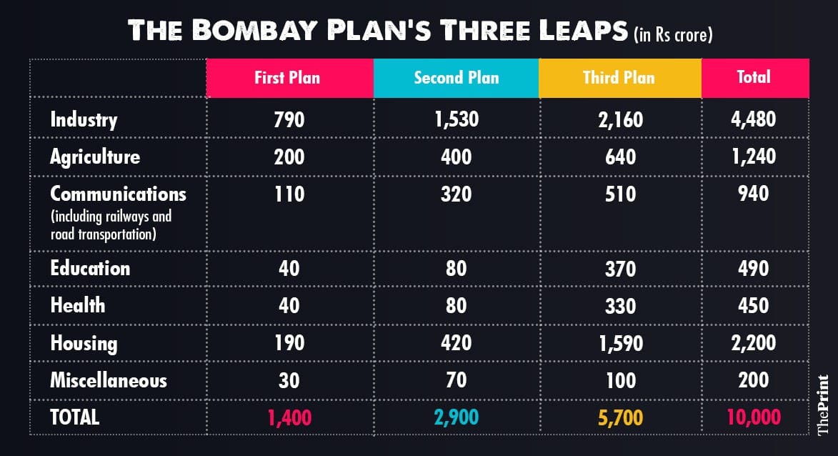 The Bombay Plan aimed to express the authors’ views on the post-Independence economy. It had the following components: a transition from agricultural domination to industrialisation; the allocation of resources through centralised planning, and the division of industries into ‘basic industries’, dominated by the State, and ‘consumer industries’, left to the private sector. From its outset, the plan acknowledged the primacy of the State in organising the economy and providing basic necessities to citizens. Historians such as Medha Kudaisya call the plan “a revolutionary idea” in State planning since it adopted a middle way for the private sector to coexist in a planned economy. On the other hand, Vivek Chibber in Locked in Place, argues that the plan was a way for businesses to entrench their own vested interests. (Vivek Chibber, Locked in Place: State-Building and Late Industrialization in India (Princeton, N.J. ; Princeton University Press, 2006), 86.)