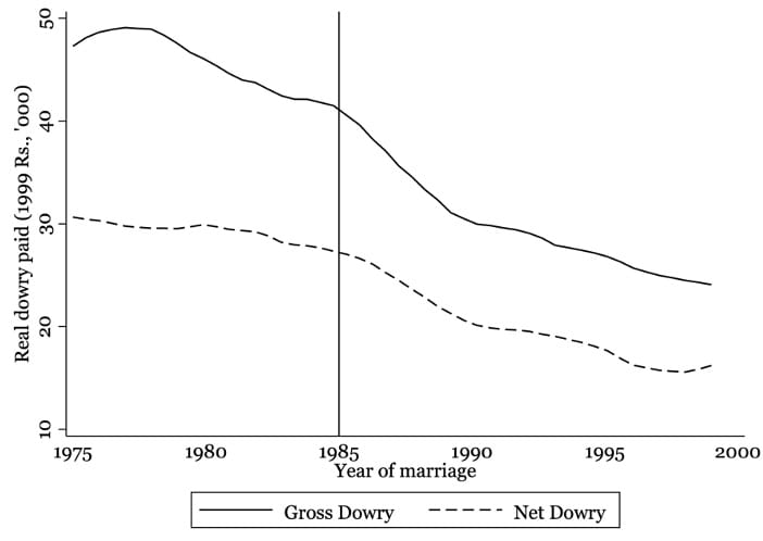 Figure 1 plots real dowry payments (from the 1999 Rural Economic and Demographic Survey, converted in 1999 INR) by year of marriage. Gross dowries are the value of transfers made to the groom’s family at the time of marriage, while net dowries are defined as gross dowries minus the value of transfers made from the groom’s family to the bride’s family. Before 1985, the average gross dowry ranged between INR 42,000 and 56,000 , and net dowries varied between INR 24,000 and 33,000. Between 1986 and 1990, both gross and net dowries declined by more than 20%. Dowry transfers kept falling in subsequent years, but at a slower pace.