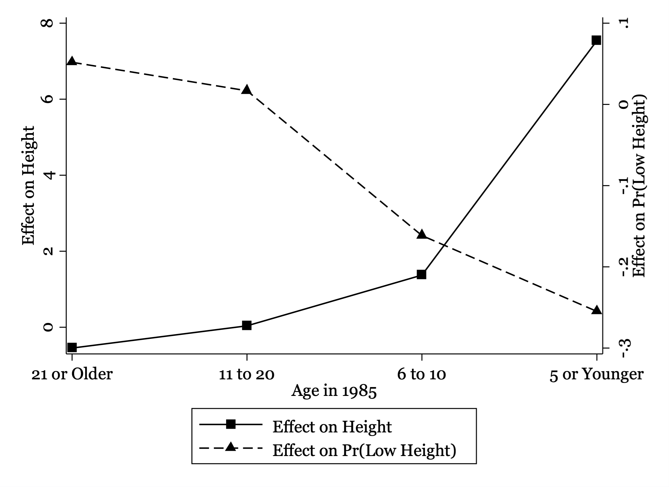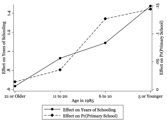 These findings are summarised in Figure 2. Panel A shows the estimated effects of the reforms on women’s education outcomes, while Panel B plots the estimated impacts on long-run health. The horizontal axis denotes each cohort’s age as of 1985. The estimated coefficients are consistent with our predictions. If possible (that is, for girls who were not too old at the time of the amendments), parents successfully improved their daughters’ human capital outcomes; the younger the girls at the time of the reforms, the more pronounced the effects.