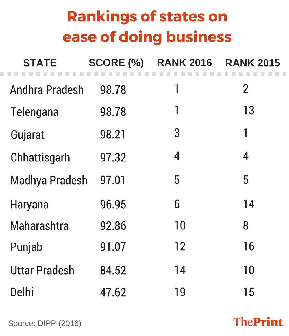 The Department of Industrial Policy and Promotion (DIPP), in partnership with the World Bank, also releases state-wise rankings on the status of implementation of business reforms. These rankings are on a similar set of performance indicators, and capture a country-wide picture of ease of doing business. The following table summarises the ranks of all states for the past two years.