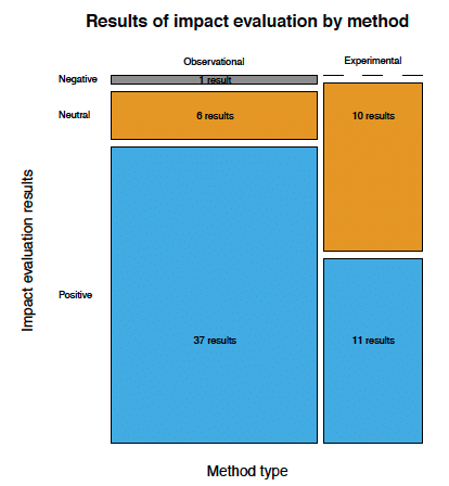 Want to argue there is at best modest impact? Go for a randomized controlled trial, following the lead of this year’s Nobelists. Want to argue that rural electrification has a large impact? Go for quasi-observational methods. Want something not too hot, not too cold? Go for a descriptive approach. As Figure 1 shows, one’s choice of method is strongly associated with the result. That is troubling, as method should not drive a substantive outcome.