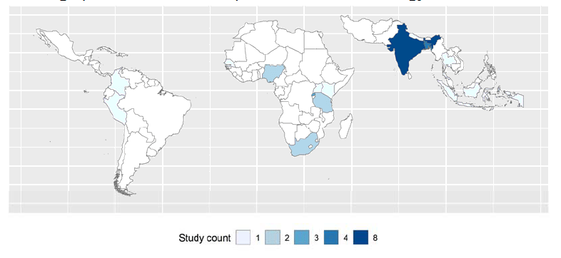 The general lack of studies is bad enough, but it gets worse when we consider geography. In another study, we show that impact evaluations of household electrification are heavily biased in favor of certain geographies (yes, Rwanda, I am looking at you). Most African countries do not have a single impact evaluation in them, even though this region has the vast majority of the world’s non-electrified households. Just look at Figure 2.