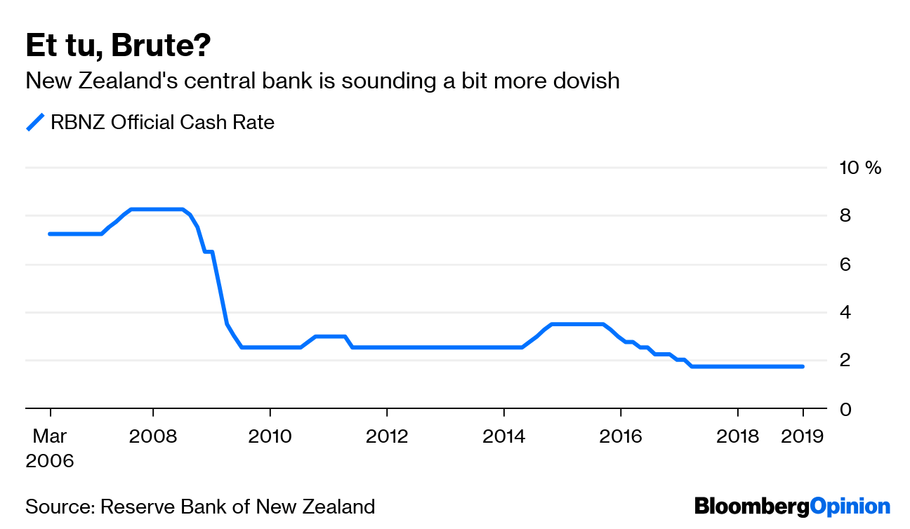 Even New Zealand, pioneer of the inflation target, is sounding a bit more dovish. The Reserve Bank of New Zealand pushed out its forecast for a hike to 2021 on Wednesday and said the next move could be up or down.