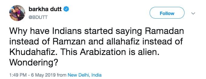 This is a completely rubbish and unnecessary allegation that pronouncing Ramadan is linked to spread of Wahhabism or it showed Indian Muslims’ inclination towards Arab culture. I am surprised that self-proclaimed liberals like Bakha Dutt are peddling this propaganda. The usage of Ramdan is limited to only Facebook posts and Whatsapp forwards. In verbal communication, Indians still say Ramzaan. Moreover, in rural areas of eastern UP, Bihar, Jharkhand and in entire Bengal people even say RAMJAAN instead of Ramzaan or Ramadan. And linking Allah Hafiz with Arabs is the height of ignorance. Arabs never say Allah Hafiz, moreover the rule of conjugation used here has been taken from Urdu/Hindi; it is alien to Arabic language. For good bye – Arabs use “Fi Aman Allah” or “Allah Ahfezak Ma’Assalama”… Interestingly, there is no raging debate on the usage of DIPAWALI instead of the more popular DIWALI and VIJAYDASHMI instead of DUSSEHRA… !!!