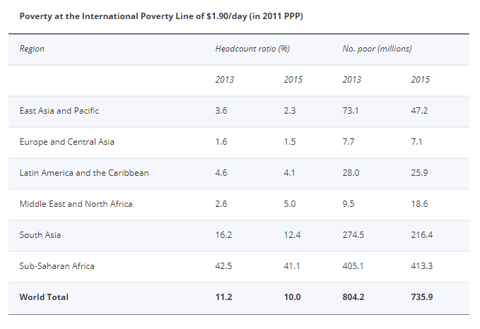 The table below summarises poverty estimates in 2013 and 2015, globally and for all World Bank regions. The international poverty line is currently valued at $1.90 in terms of 2011 purchasing power parity, which equalises its purchasing power across all countries and currencies.