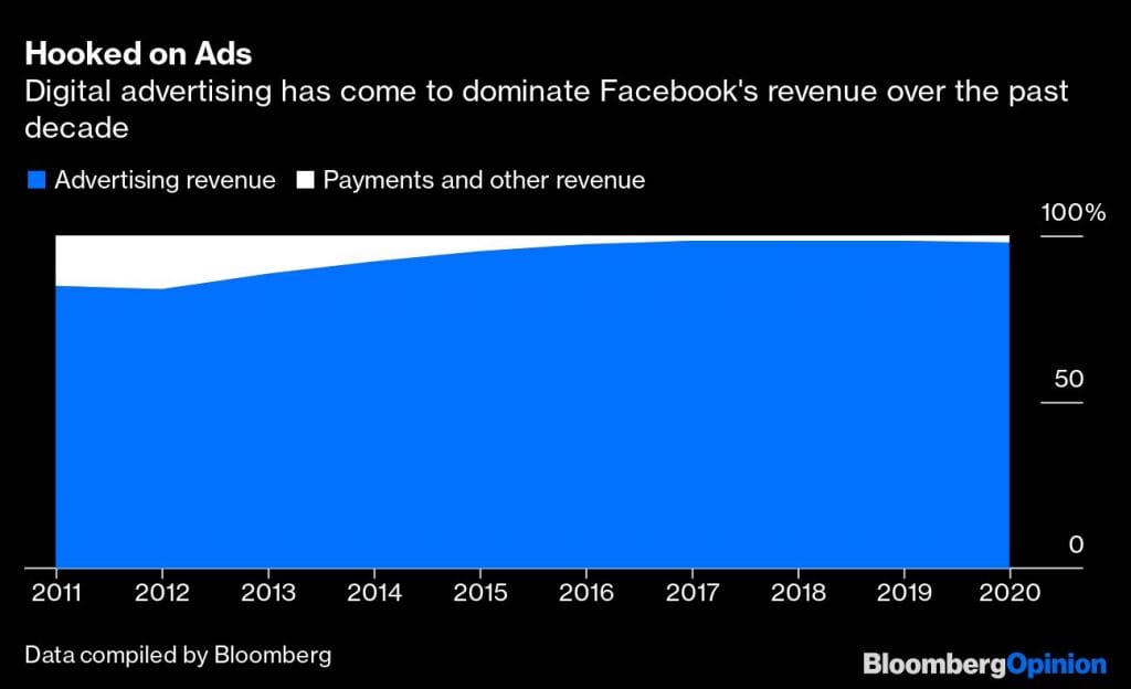 Over the years, that slice of revenue dwindled to almost nothing, as Facebook’s addiction to the advertising business grew. That has left Facebook — the least diversified Big Tech firm — vulnerable to any drop in users and their all-important engagement metrics with advertisers.