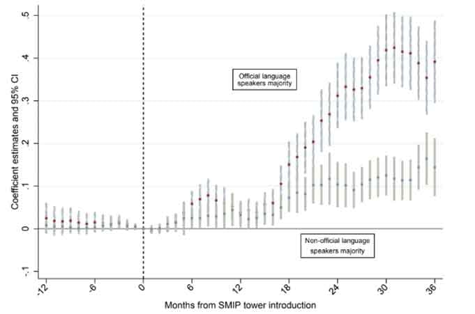 Figure 1a shows the evolution of farmers’ calls to the KCC after the construction of a new mobile phone tower. The figure shows that the number of calls to the KCC, which originated from a certain area, increases substantially following the construction of a new mobile phone tower in the area. These findings are consistent with a large and under-served demand for agricultural advice among Indian farmers. Figure 1b shows that that the increase in calls is concentrated in areas where the majority of the local population speaks one of the official languages in which the calls are answered by the KCC.