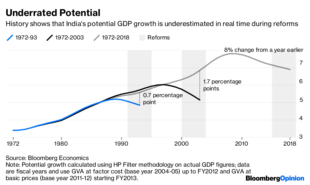 It would also be a belated recognition that the Modi government has boosted India’s potential growth rate — the pace at which the economy can grow without generating inflation. Governments everywhere prefer lower interest rates so as to juice the economy without having to undertake politically tough structural reforms. In India’s case, on the other hand, the government has willingly introduced multiple structural reforms over the last few years, including a new indirect tax structure that has widened the tax net and removed inter-state barriers to trade, a new bankruptcy law that’s improving the credit culture and strengthening bank balance sheets by chasing defaulters, and multiple measures to improve the economy’s ease of doing business.