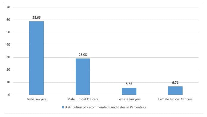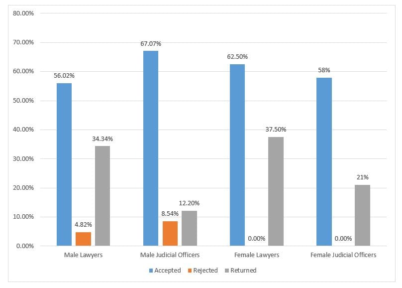 It is possible that there are just more qualified lawyers than there are judicial officers and more qualified men than women. But such an explanation would run contrary to the fact that the proportion of rejected/returned names for lawyers is higher than that of judicial officers. Similarly, the rate of acceptance is higher for women lawyers than their male counterparts. While the difference in the acceptance rate of male judicial officers and female judicial officers is only 9%, the difference in their recommendation figures is 22%.