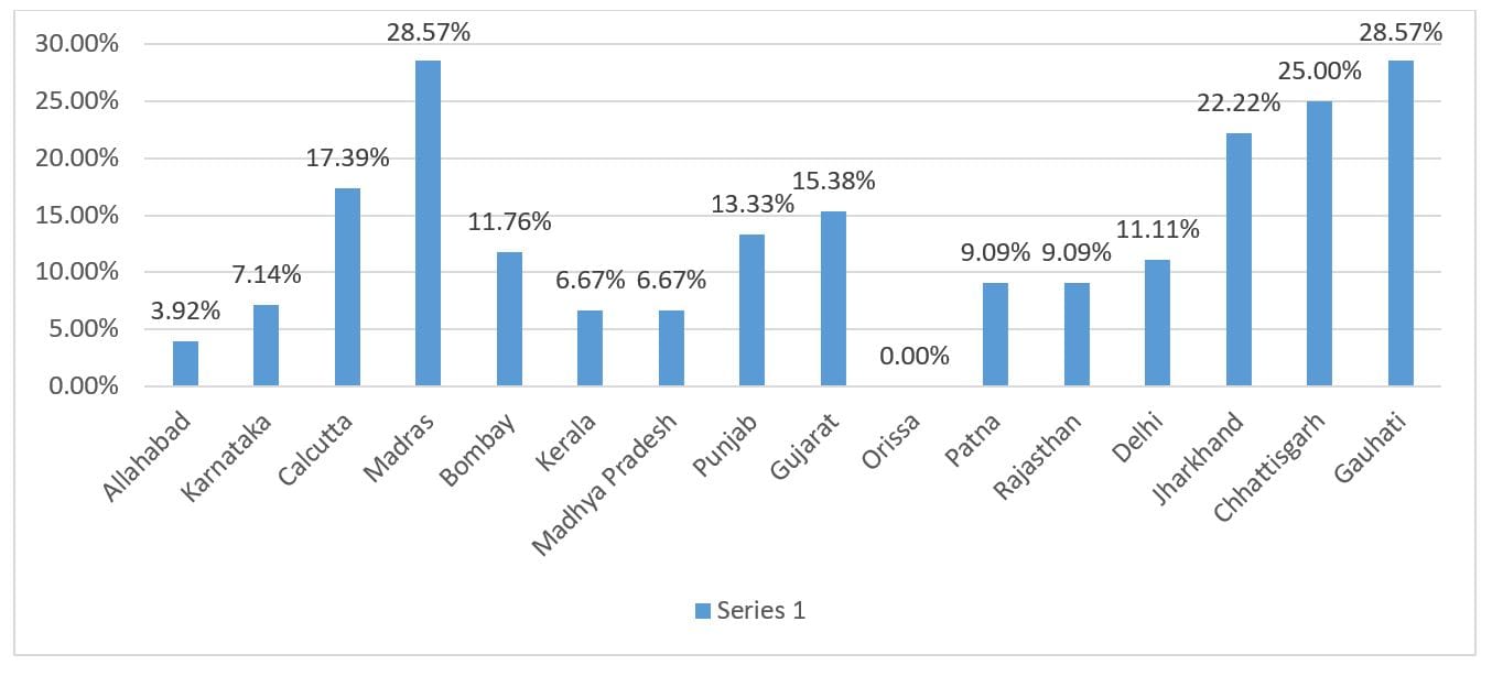 The numbers show that almost all high court collegiums are equally monolithic in their recommendation patterns. Not a single high court collegium recommended more than 30 per cent women for judgeship. For many high court collegiums, the number is below 10 per cent. Figure 4 shows the proportion of women candidates recommended by different high court collegiums that had more than five recommendations considered by Supreme Court collegium in the identified time frame.