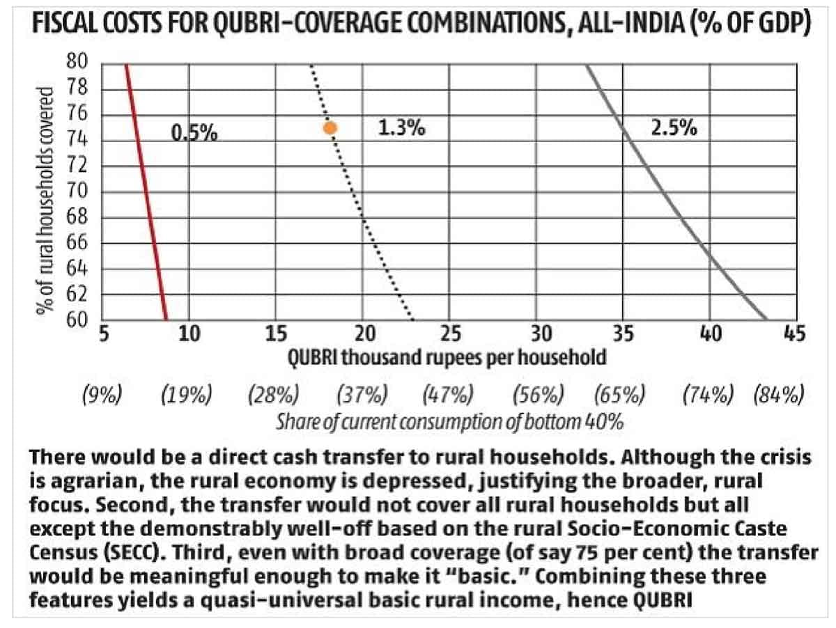 There would be a direct cash transfer to rural households. Although the crisis is agrarian, the rural economy is depressed, justifying the broader, rural focus. Second, the transfer would not cover all rural households but all except the demonstrably well-off based on the rural Socio-Economic Caste Census (SECC). Third, even with broad coverage (of say 75 percent) the transfer would be meaningful enough to make it “basic.” Combining these three features yields a quasi-universal basic rural income, hence QUBRI.