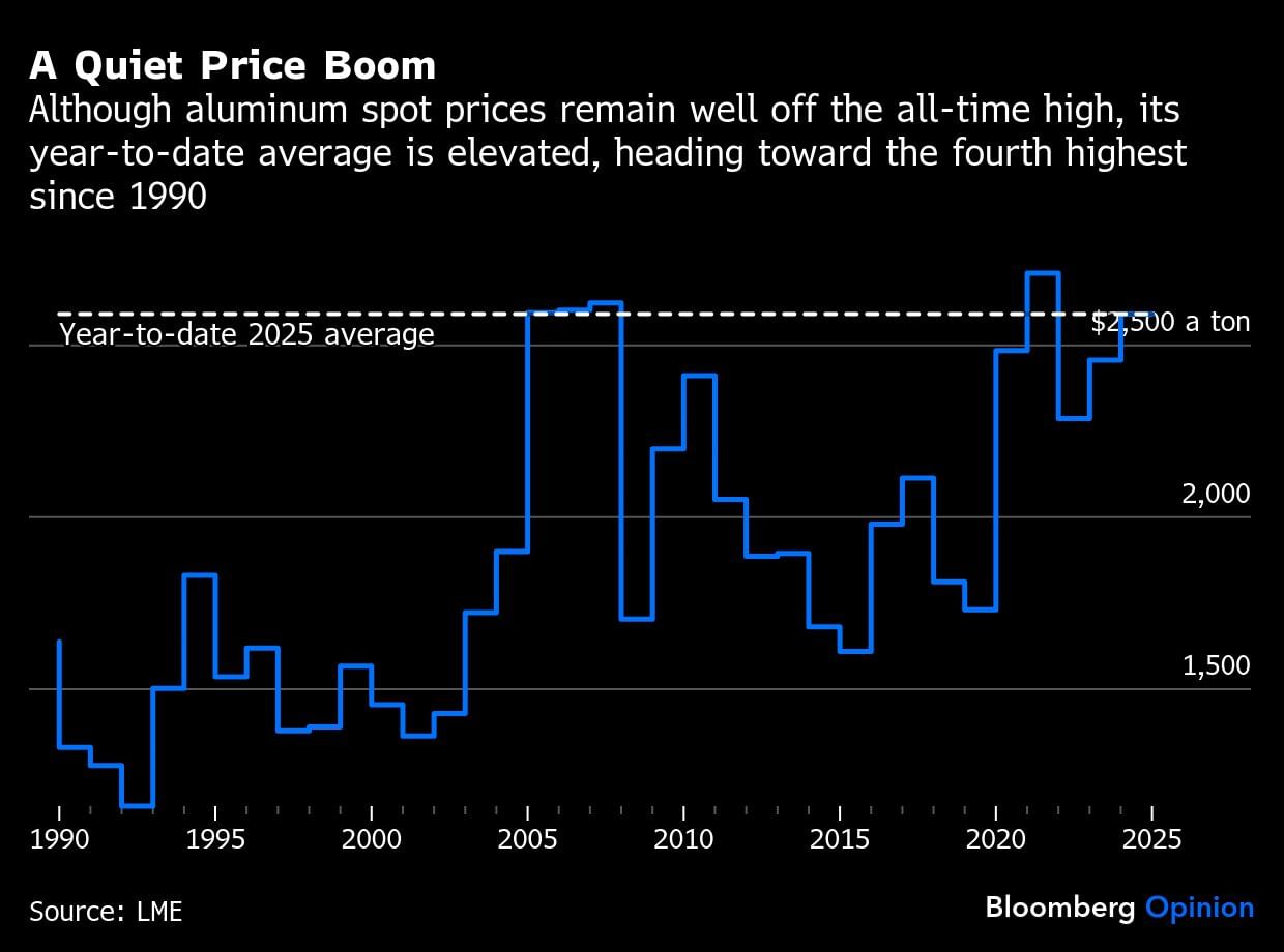 It lacks the effervescence of copper and the geopolitical allure of rare earths – yet aluminum is the metal of the moment. Key to modern life and everywhere in the global economy, it’s entering a make-or-break phase: Either the world is sleepwalking into a supply crisis or further into the hands of China. Or, more worryingly, both. The background is unsettling: Aluminum is trading at a three-year high, near $2,900 per metric ton. Although still far from the record, the current price is historically elevated, in the 5% top end of the 1990 to 2025 price range(1). Look at annual averages, and this year is heading to the fourth-highest ever.