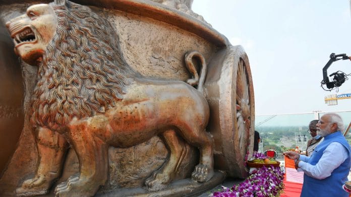 The new Lion Capital installed atop the new Parliament building is a small piece in the new symbolic order. There is, no doubt, a difference — not just in camera angle — between the Sarnath original and its latest “interpretation”. The original Lion Capital of Asoka stood for what has been called the “righteous republic”: power in its calm and majestic form, guided by the dharmachakra, the wheel of righteousness. In his essay ‘Choosing the National Symbols of India’, this is how Professor Bhikhu Parekh interprets the national emblem: “The lions, sitting back to back and facing in four directions, are taken to signify the importance of power, which is supposed to be stable and desirable only when guided by the law of righteousness as symbolized by the wheel.”