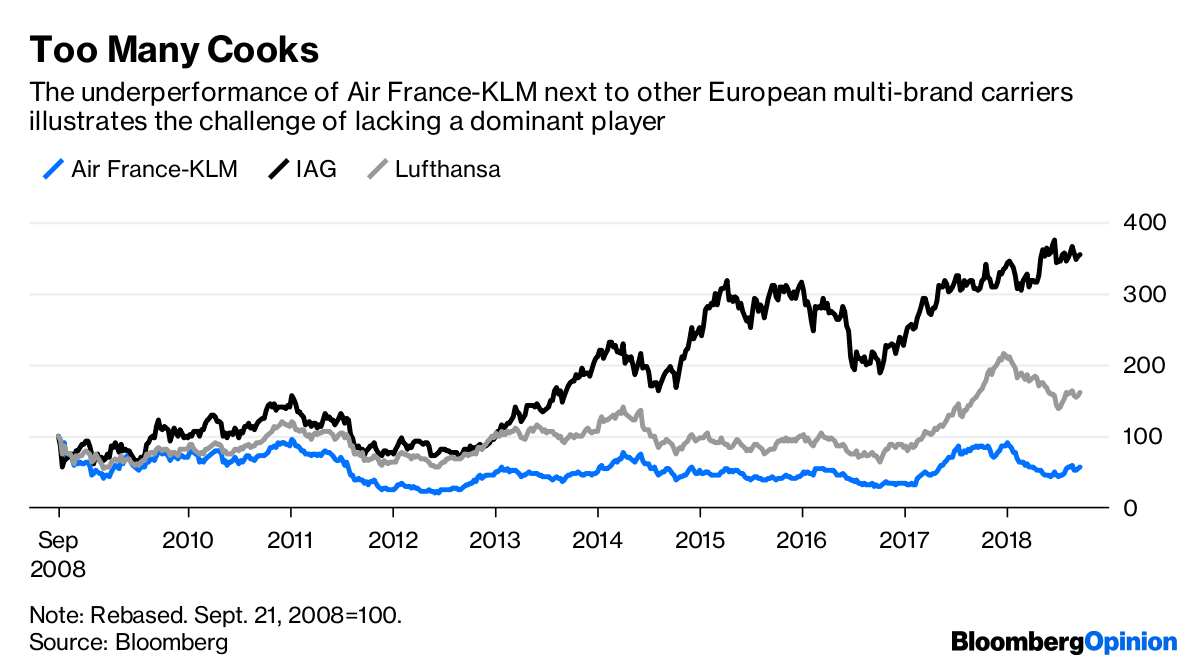 There are potential solutions out there. Perhaps the route network can be split such that all but a handful of low-margin passengers transit at one site or the other. Air France-KLM has managed to survive, however awkwardly, as a twin-hub carrier; though the experience of the much more lopsided Deutsche Lufthansa AG and International Consolidated Airlines Group SA demonstrates the advantage of picking one dominant hub.