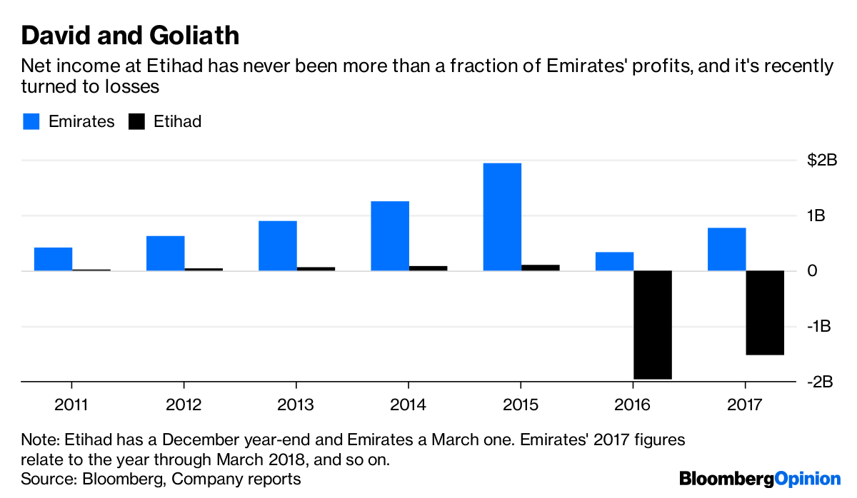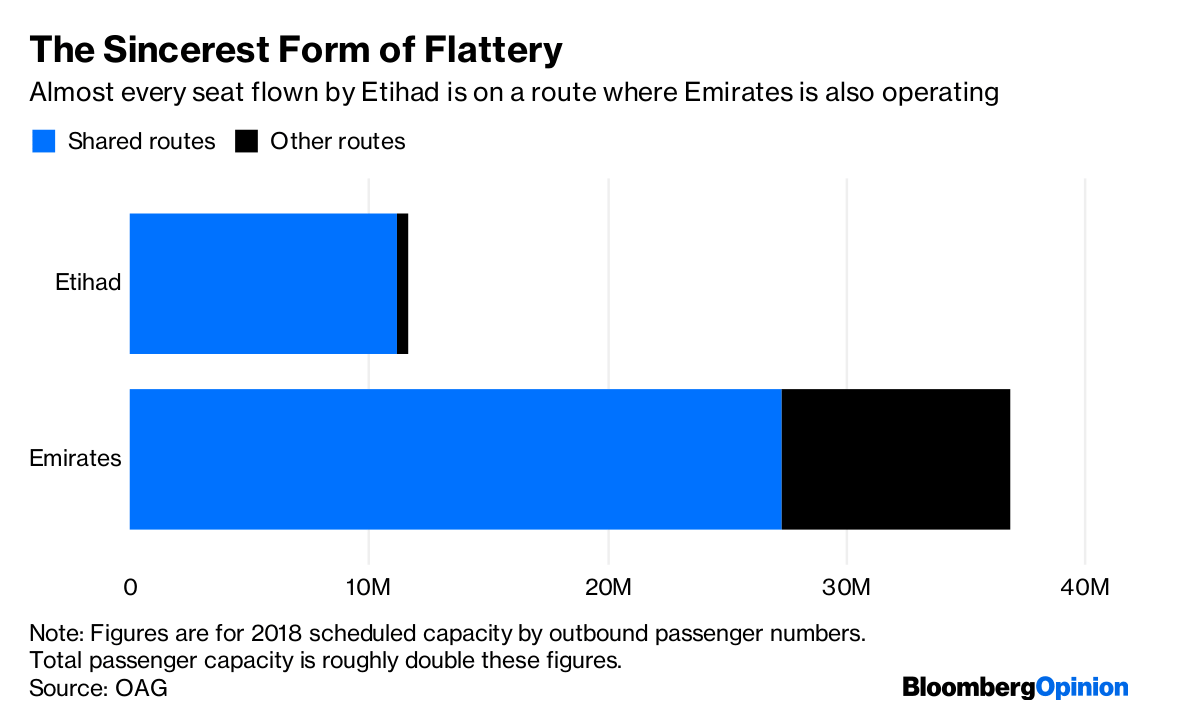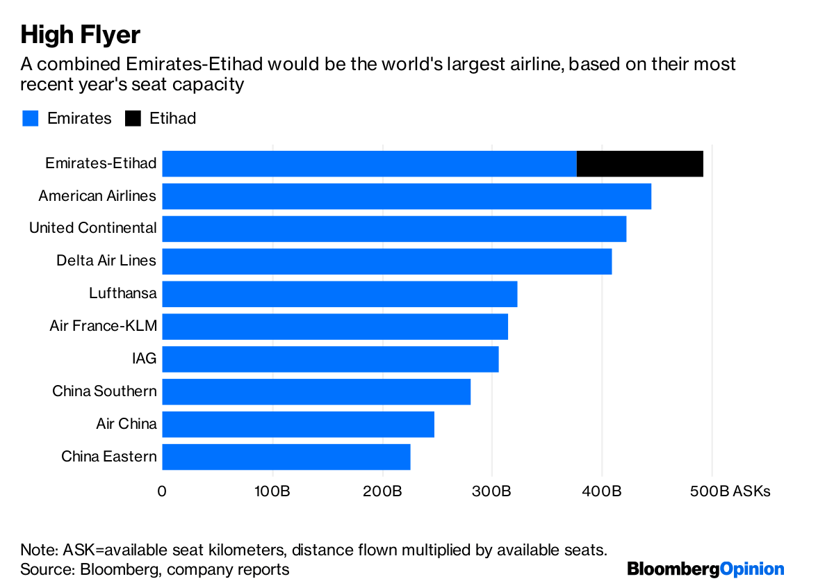 That means that the sensible, radical path isn’t really an option. The combined group will somehow have to maintain service levels to Abu Dhabi to please the Al Nahyan family, the final arbiter of economic and political power in the U.A.E., while doing its best to build up its core hub in Dubai.