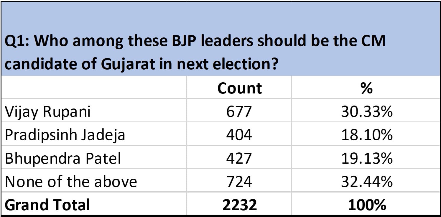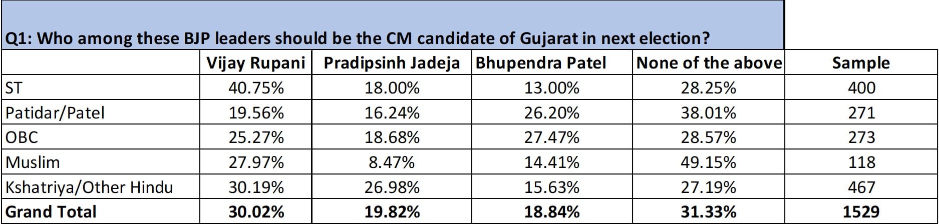 Remember, the purpose of the survey was not to find out the most popular CM candidate but to test if voters prefer an unknown Patidar to a known non-Patidar as the CM candidate, which is what the BJP gamble seems to be.