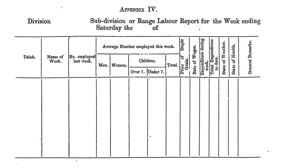 Figure 1: Figure: an idealised worksheet at relief camps, demonstrated to the British parliament by T.G. Hewlett, Sanitary Commissioner of Bombay Presidency