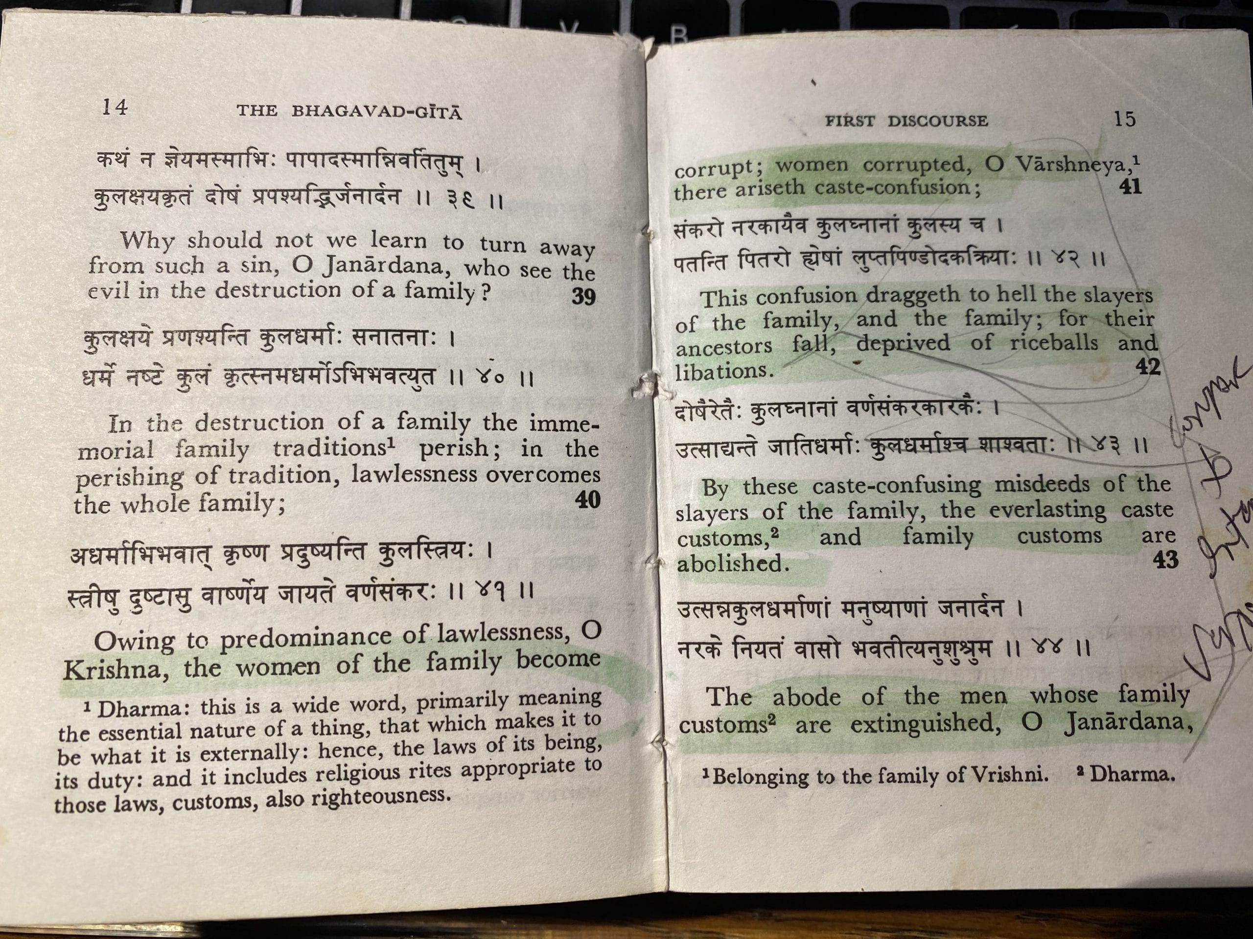In the Bhagavad Gita (I: 41-44), the Pandava prince Arjuna shares his serious misgivings with Lord Krishna about going into a bloody war with his cousins, the Kauravas.