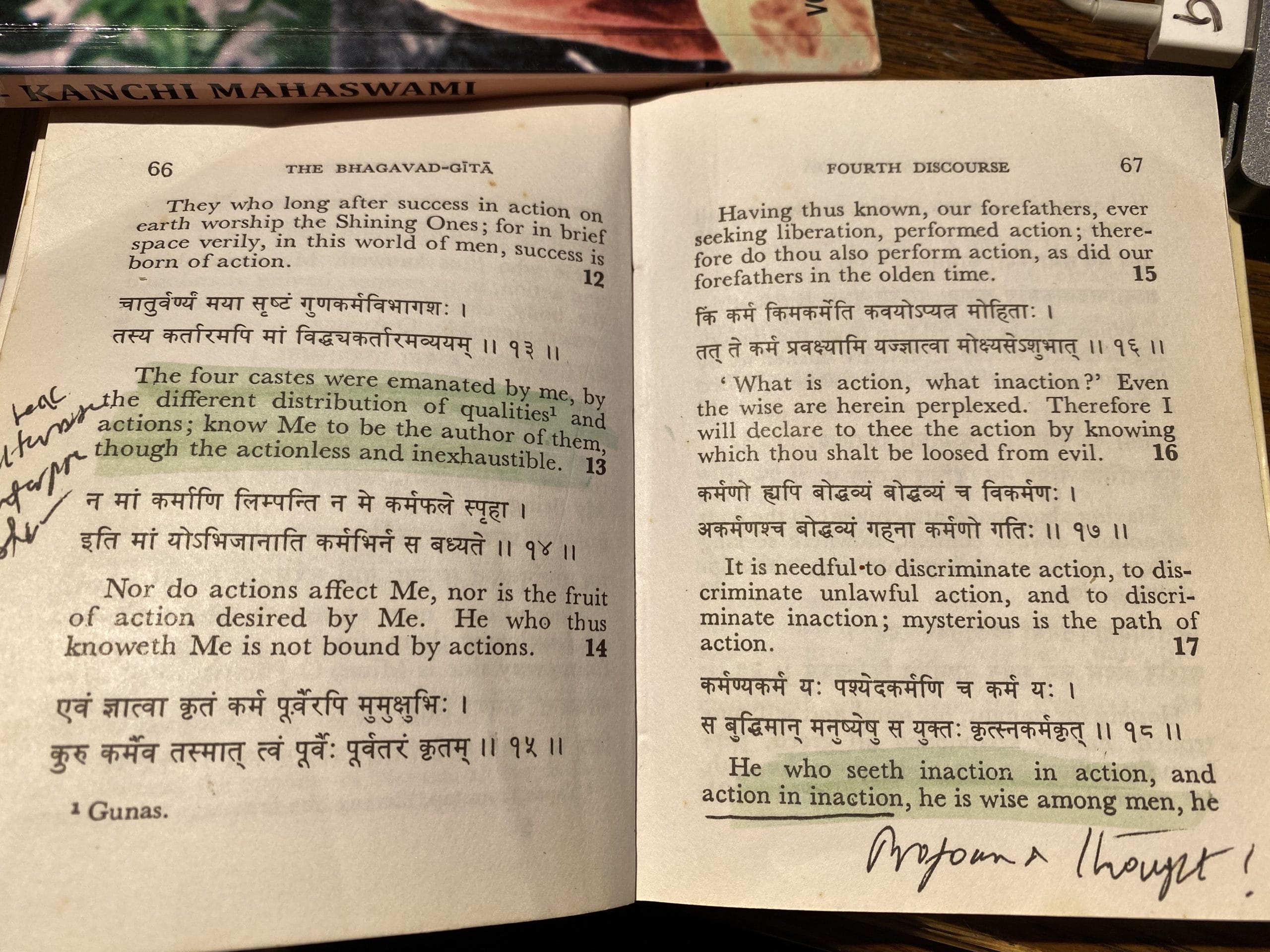 In its lectures, it emphasises the one passage in the Bhagavad Gita (IV:13), where Krishna declares that it was he who created the four varnas, based on the three-fold gunas (attributes) of an individual: “tamas (darkness, delusion and ignorance), rajas (passion, desire and attachment), and sattva (light, harmony and balance).”