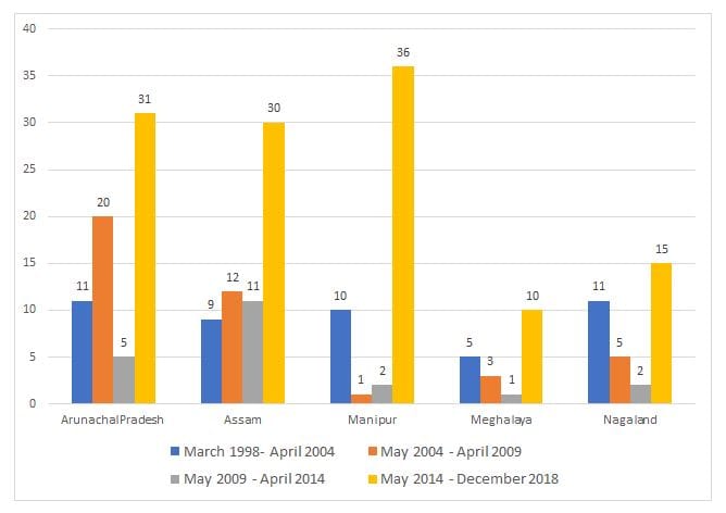 It suggests that the BJP’s spectacular performance is hardly surprising. Even in the past, during the Atal Bihari Vajpayee-led first NDA government (blue colour bar), the BJP did perform well, but post-2014 Lok Sabha polls, the party has been nothing short of a hegemon in the northeast.