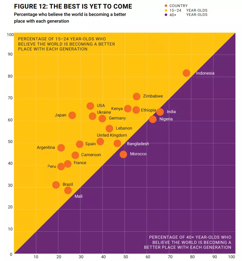 Most young people feel the world is getting better over time, and children in their country will be more prosperous than their parents.