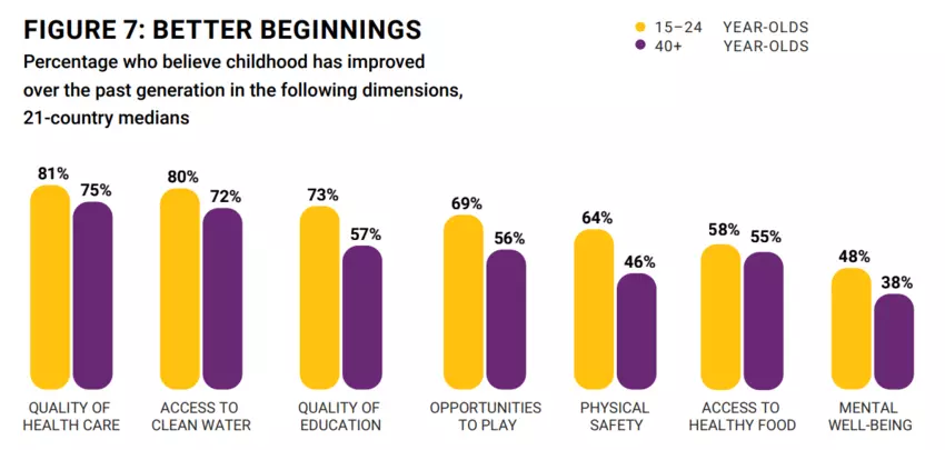 Younger people are also more optimistic about childhood and the progress that has been made against markers such as safety, quality of education, healthcare, opportunities to play, and access to clean water and healthy food.