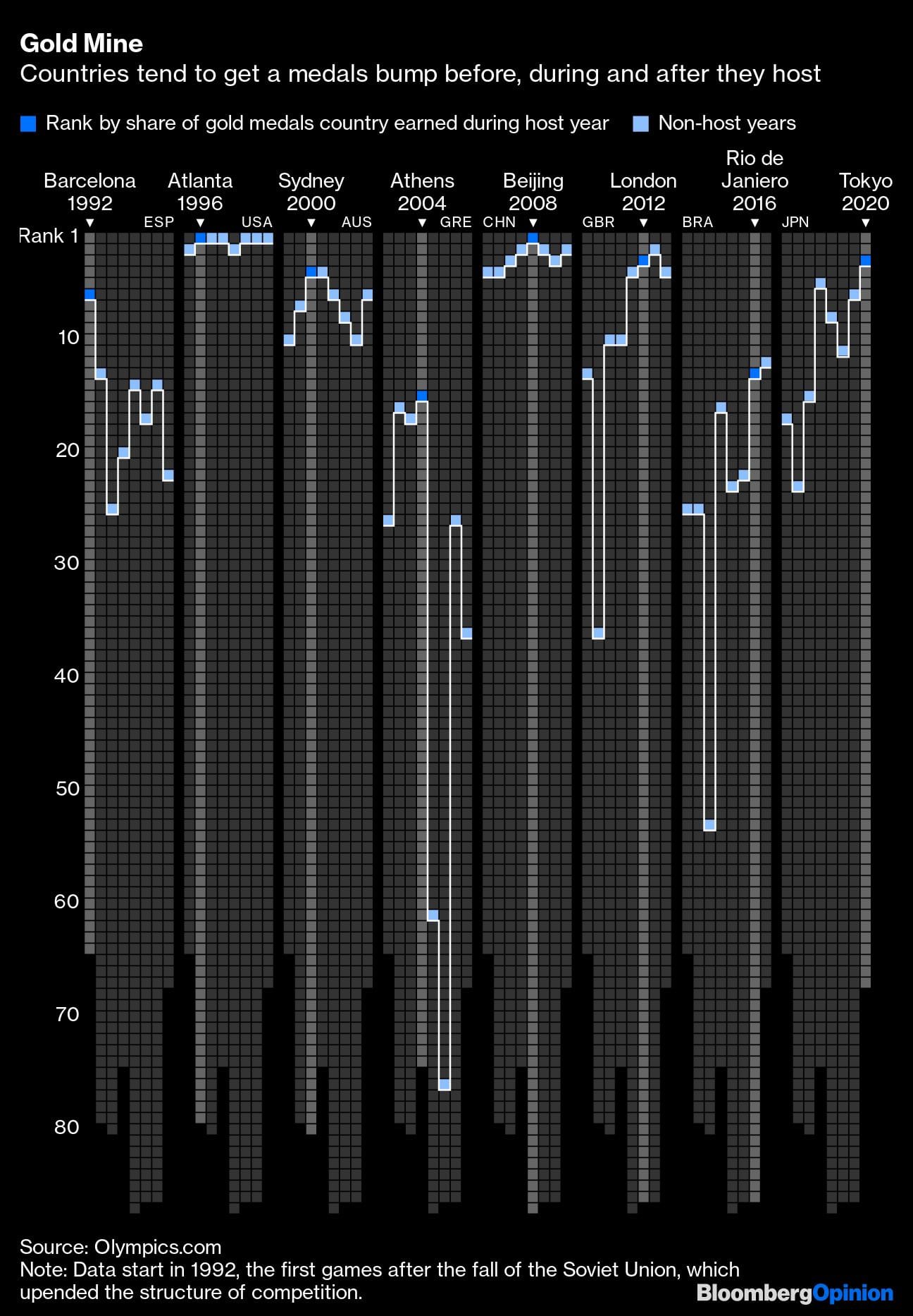 This isn’t a one-time phenomenon. An analysis of all Summer Olympics held from 1992 through 2021 shows that the single most powerful driver of medal tally, particularly gold, is hosting the event, and how many years since a country last did it. We start from Barcelona games because they were the first after the end of the Cold War. The Soviet Union — a sporting powerhouse — was broken into numerous independent states, including Russia, that are collectively and individually weaker, making comparison with earlier editions invalid.