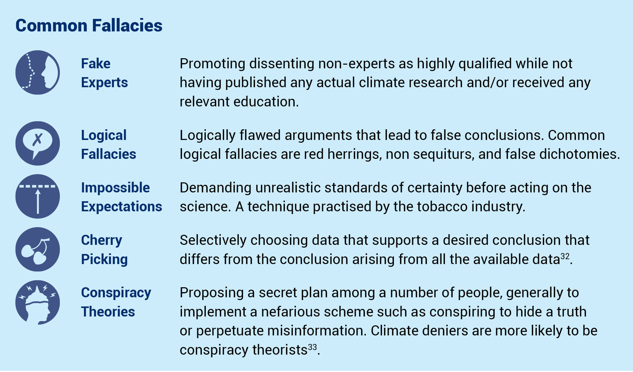Climate denial arguments can be summarized by the five techniques of science denial (summarized with the acronym FLICC): fake experts, logical fallacies, impossible expectations, cherry picking, and conspiracy theories.