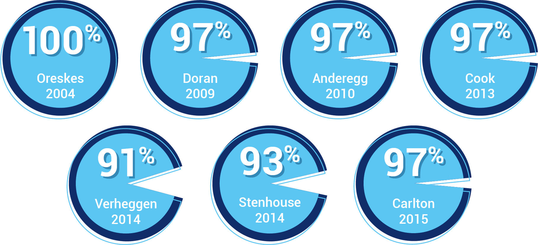 In the late 1980s and early 1990s, a scientific consensus emerged that human-caused climate change — which had long been predicted — was now underway. Since that time, a number of studies have found over 90% agreement among climate scientists on human-caused global warming, with multiple studies converging on 97 per cent consensus.