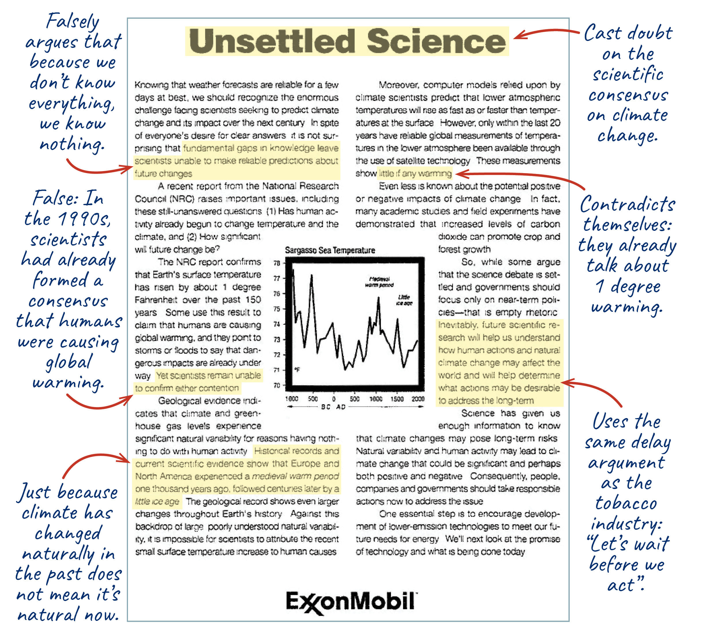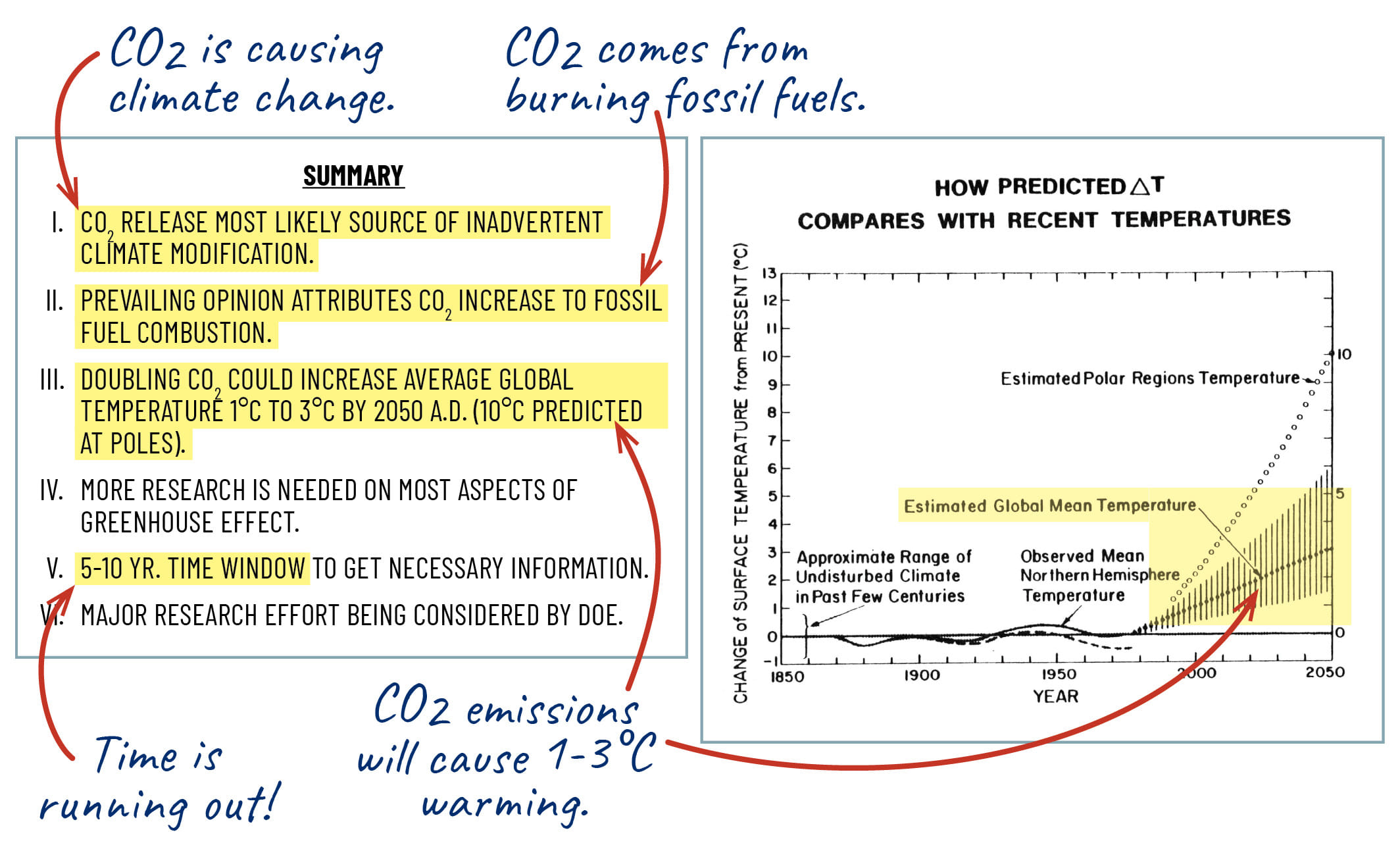 Scientists working for the fossil fuel industry knew about the potential warming effects of CO2 emissions as early as the 1950s. Exxon’s internal documents show that their own scientists were explicitly aware of the potential dangers of human-caused climate change caused by their products, but instead of taking action or warning the public, they spent millions of dollars on disinformation campaigns designed to obscure the scientific reality.