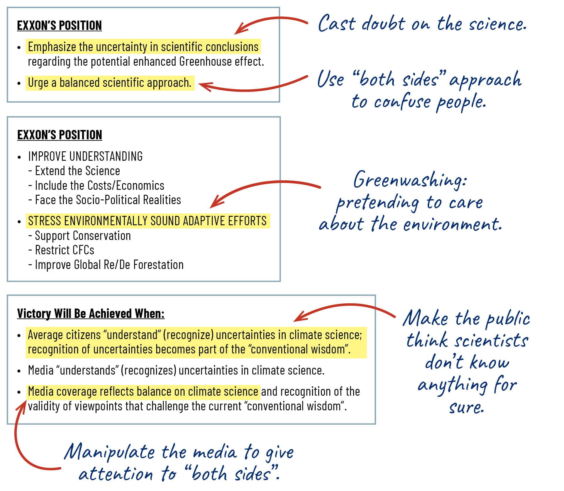 Over the past few decades, the fossil fuel industry has subjected the American public to a well-funded, well-orchestrated disinformation campaign about the reality and severity of human-caused climate change. The purpose of this web of denial has been to confuse the public and decision-makers in order to delay climate action and thereby protect fossil fuel business interests and defend libertarian, free-market conservative ideologies. The fossil fuel industry’s denial and delay tactics come straight out of Big Tobacco’s playbook.