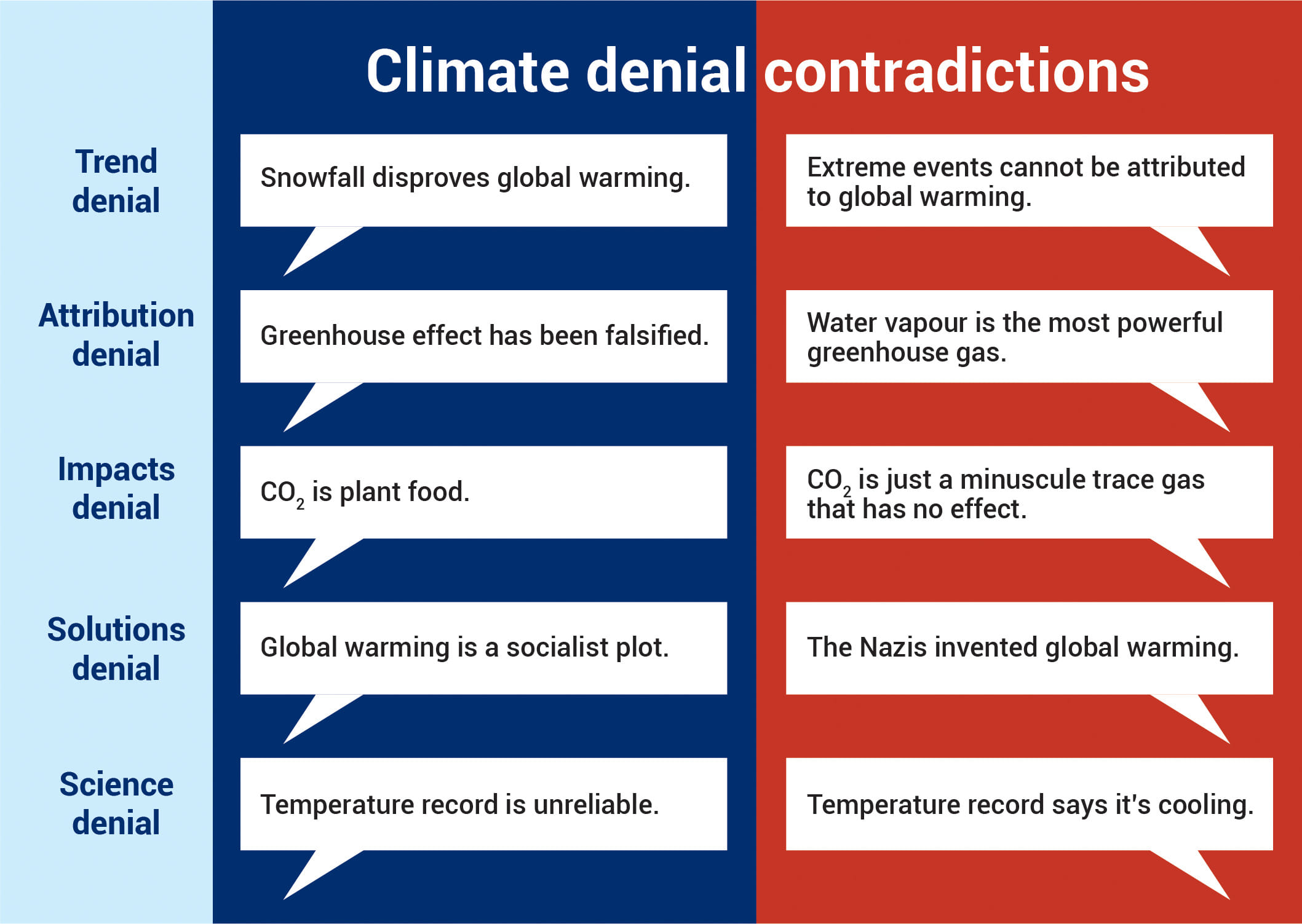 The most common denialist arguments have been shown to contain fatal assumptions or fallacies. Climate deniers do not offer any rational explanation for why our climate is changing. Rather, denialist arguments are incoherent and often contradictory. For example, deniers will seize on snowfall to claim that global warming is a hoax, while at the same time claiming that an extreme event such as a drought or wildfire cannot be attributed to climate change. This is incoherent because either extreme events can be a signal of climate change or they cannot be.