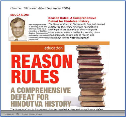 In 2006, a Superior Court in California rendered a landmark judgment on the HAF’s lawsuit against the California State Board of Education (SBE), challenging the sixth grade History-Social Sciences textbooks. Among other things, the HAF and its allies had objected to the coverage of the caste system, women in ancient India, the story of the Aryans, and the use of the word Dalit, etc., and had sought to stop the publication of the textbooks.