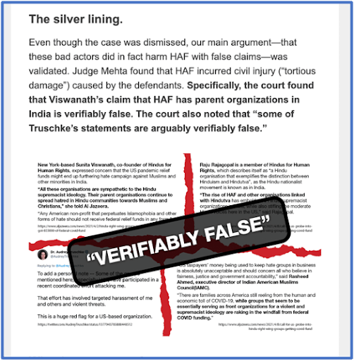 Despite its ignominious defeat in the defamation lawsuit against Sunita Viswanath and me, Rasheed Ahmed of the Indian American Muslim Council, John Prabhudoss of the Federation of Indian American Christian Organizations, and Prof Audrey Truschke of Rutgers University, the Hindu American Foundation continues to claim that it has been vindicated: They are now trying to put words in the judge’s mouth by incorrectly claiming that the court had determined that Sunita and Audrey had lied about the HAF.