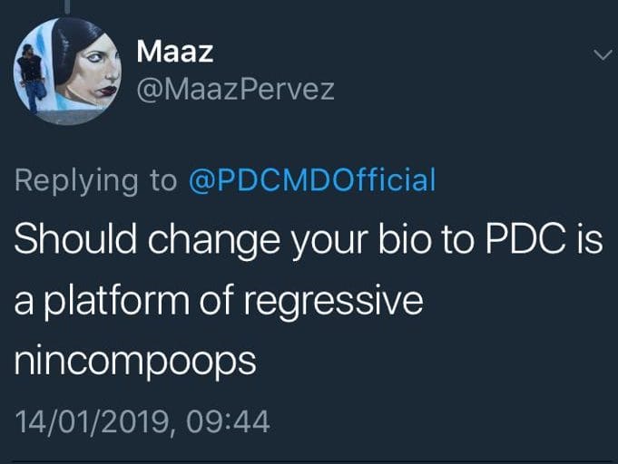“Should change your bio to PDC – platform of regressive nincompoops.”