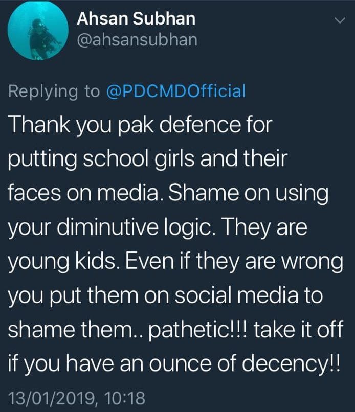 “Thank you Pak Defence for putting school girls and their faces on media. Shame on using your diminutive logic. Take it off if you have any decency.”