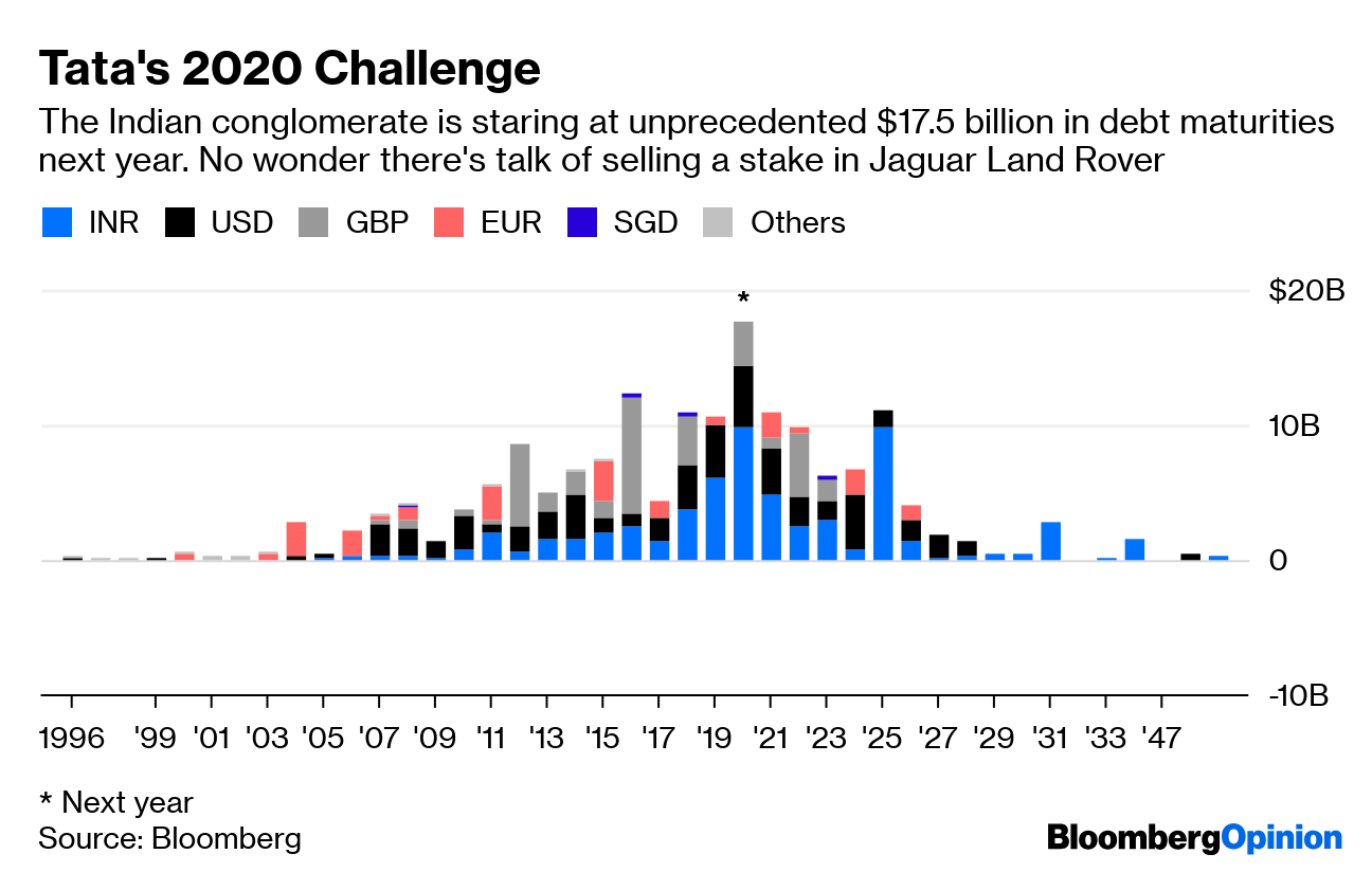 The insufficiency of those dividends became a sore point in a 2016 boardroom battle between patriarch Ratan Tata and Chairman Cyrus Mistry, who was abruptly ousted after less than four years. Borrowing on the strength of operating companies’ cash flows has a limit. Next year will see a record $17.5 billion of debt mature, according to bonds and loans data compiled by Bloomberg. The conglomerate must step up investment in order to generate more free cash.
