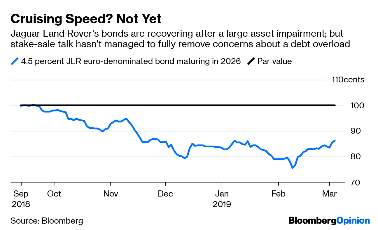 U.K.-based Jaguar Land Rover Automotive Plc is burning cash on electric-vehicle technology just as the double whammy of a Chinese auto slowdown and Brexit threatens margins and sales. At average cash burn rates of 670 million pounds ($882 million) a quarter, the British carmaker may struggle to make it through another year, my colleague Anjani Trivedi wrote last month after it took an asset impairment charge of 3.1 billion pounds.