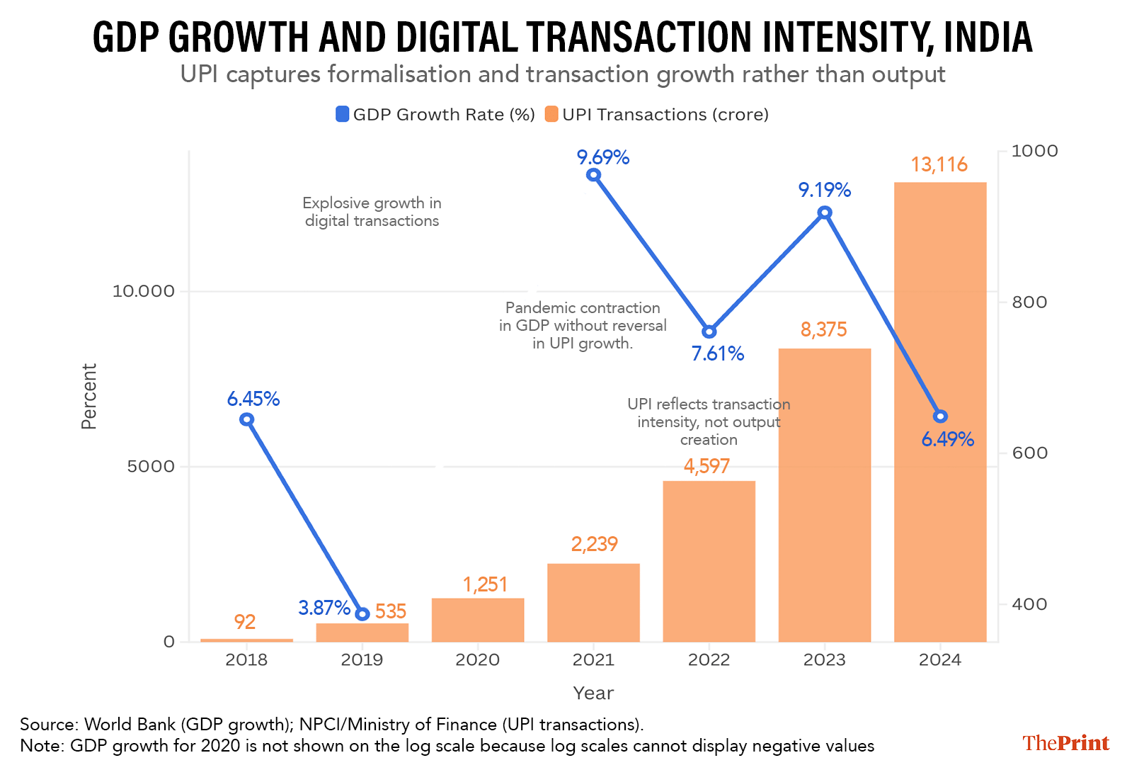 Since 2018, UPI transactions have experienced exponential growth, even as GDP growth has remained within a relatively narrow range and briefly contracted during the pandemic. This divergence neither validates nor invalidates GDP growth; rather, it underscores how an increasing portion of economic activity now manifests in forms—formalised, digital, and services-led—that do not leave strong physical nor tradeable footprints, highlighting the necessity for a broader validation framework.
