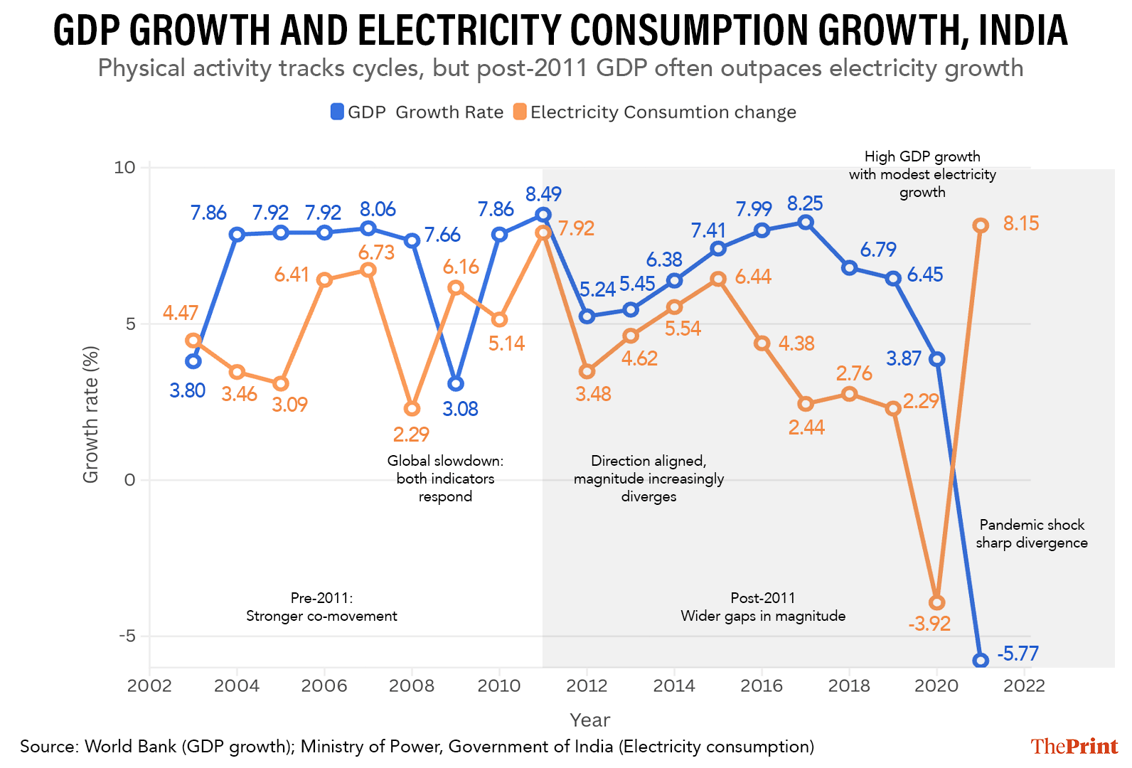 This brought a technical concept into focus: the non-stationarity of correlations. In simpler terms, it implies that the relationship between economic variables does not remain constant as an economy evolves. Indicators that were effective in a manufacturing-heavy economy may lose relevance as services, digital activity, and intangible output expand. Critics argued that electricity use, freight movement, and fuel consumption are goods-biased measures. If growth increasingly stems from software, finance, healthcare, logistics platforms, or digital services, it may leave a weaker physical footprint. A breakdown in correlation, therefore, does not automatically imply mismeasurement; it may reflect genuine structural change.