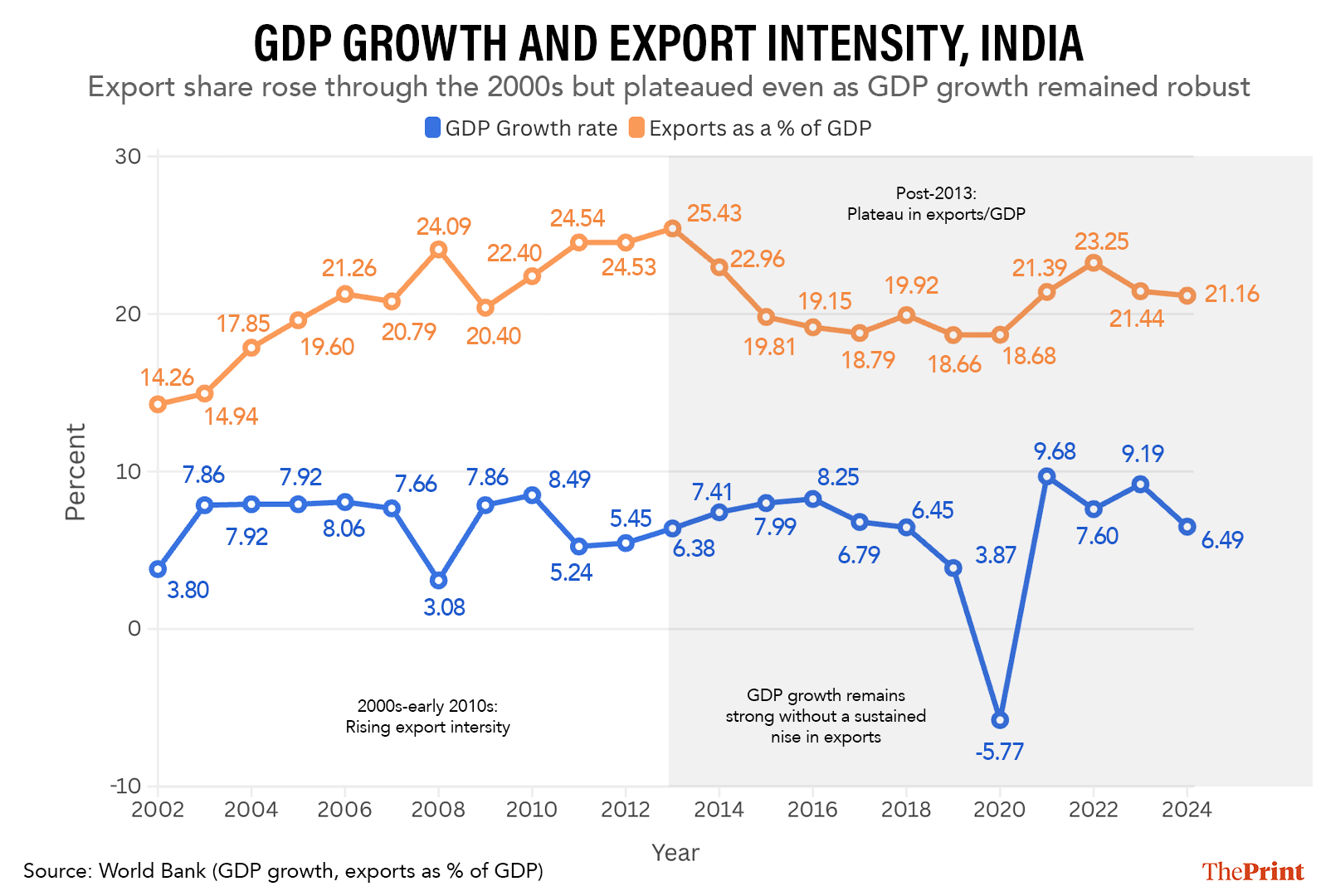 During the 2000s and early 2010s, India’s export share of GDP experienced a steady increase; however, it subsequently plateaued and declined post 2013, despite the fact that GDP often remained robust. This indicates that recent economic expansion has not been strongly reflected in the intensity of the tradeable sector.