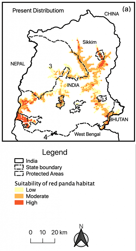 Protected areas are demarcated with the hope that some measure of conservation is achieved in these patches. But animals know no boundaries and occupy spaces that can go far beyond protected areas. Sikkim has eight protected areas (PA) that spread across its four districts. Except for the Kitam Bird Sanctuary, all of these PAs are located at elevations that are suitable for red pandas. While most of these protected areas in Sikkim harbour red pandas, our research findings show that as much as 66 per cent of their habitat extends to contiguous forests that are beyond the PAs. This has been arrived at by combining data from extensive fieldwork gathered by the teams with modelling exercises.