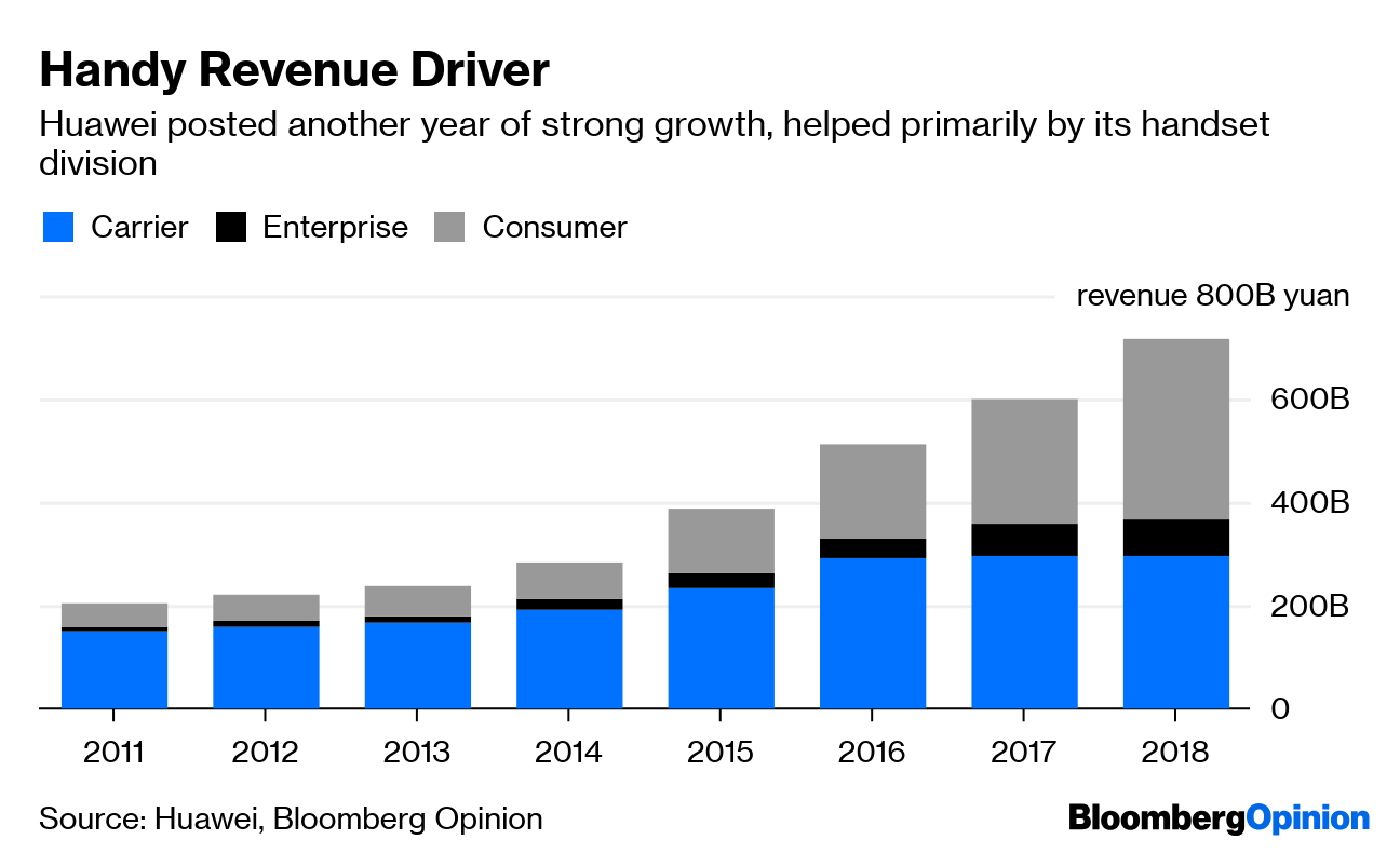 You might argue this is a chicken-and-egg situation – the carrier business slipped relative to the total because of global pressure – but in reality, the drumbeat against Huawei picked up only in the second half of 2018. Multimillion-dollar networking contracts don’t fall by the wayside so quickly.