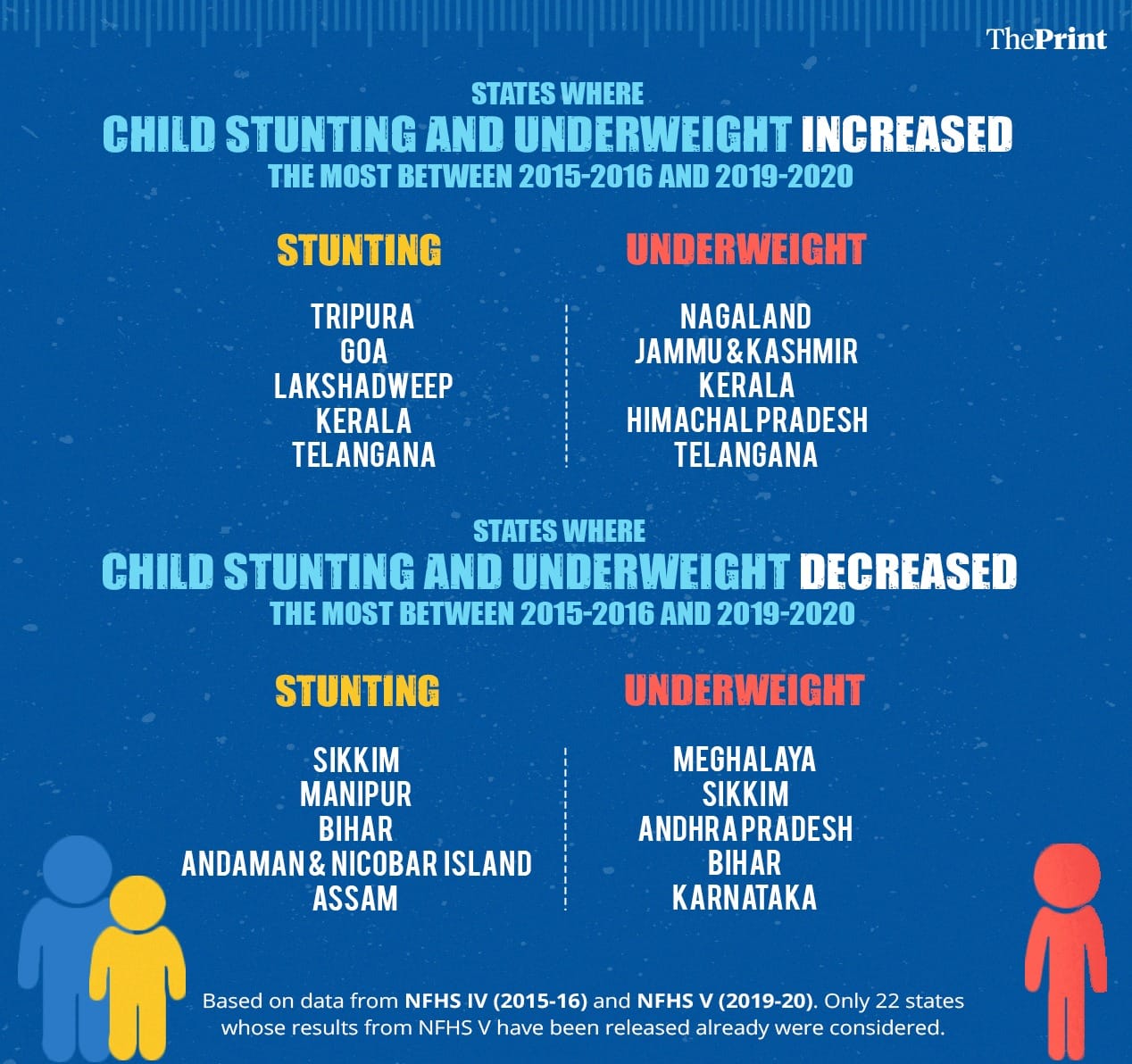 After witnessing reduction in child malnourishment in the last twenty years, the trend in India seems to be reversing. Data from the latest round of the National Family Health Survey (NFHS 2019-20) released for 22 Indian states indicate that in the past five years, more than half of the states experienced an increase in child stunting (children too short for age) and more than two third increase in child underweight (children too thin for age). The table below shows which of the 22 Indian states have been most successful and which least in tackling child stunting and underweight. In the last two years, Indian children’s nutrition outcomes have been further negatively affected by the ongoing Covid-19 pandemic.