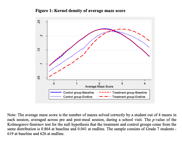 There are two possible mechanisms through which school meals can improve cognition. One is the health-nutrition channel- school meals lead to an improvement in health status and, thereby, cognition. The second is the hunger alleviation channel – school meals reduce hunger in classroom. Our study suggests that the increments we observed were due to the hunger alleviation mechanism. First, we see no improvement in students’ health outcomes in treatment schools compared to the control group. Second, we only see improvements in scores in the puzzle-solving sessions held after the meals were distributed on a school day. We see no significant gains in maze scores in sessions held before meal distribution, something we would have expected to see if this was driven by improved health status.