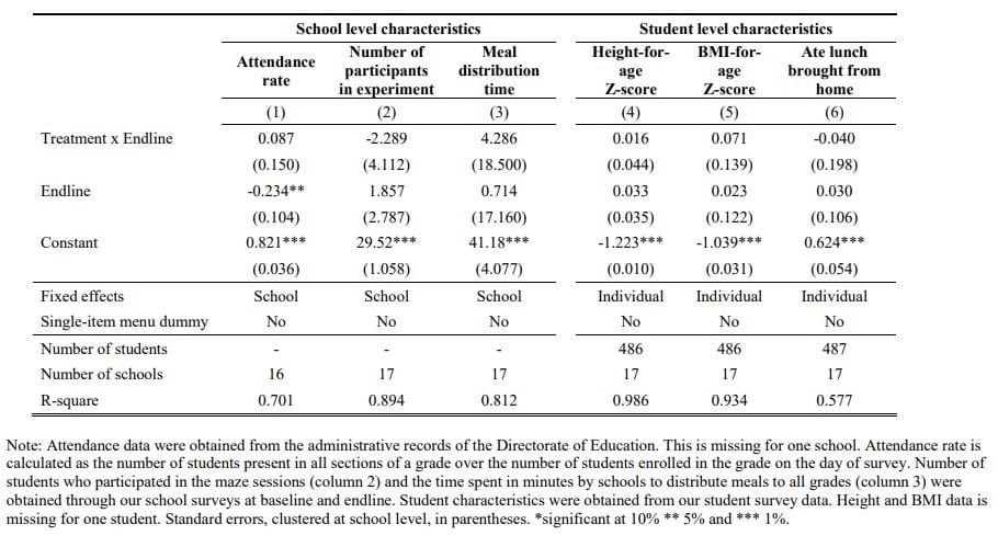 Furthermore, any classroom behavioural changes, such as reductions in disruptions because students may be more attentive after receiving supplementary nutrition, are unlikely to explain our findings given that the tests were administered in a relatively ‘controlled’ environment. Hence spillover effects through changes in programme uptake, do not appear to have impacted performance on our cognitive task. We also rule out gains in performance due to any systematic changes in administrative efficiency (column 3) between the two groups of schools*.