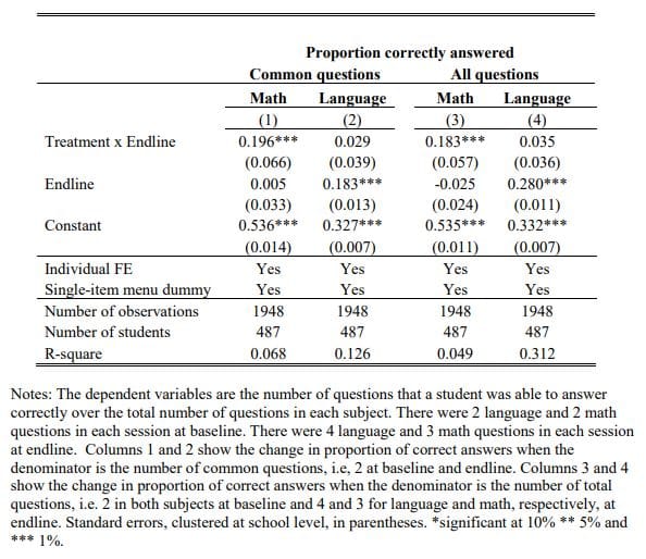 We may, however, be worried that the number of participants in our sessions in the section to which we administered the mazes may have fallen at endline, affecting performance positively in the treatment group due to fewer classroom disruptions. However, the number of participants in our classroom sessions were not significantly different between baseline and endline in the treatment schools vis-à-vis control (column 2, Table 1).