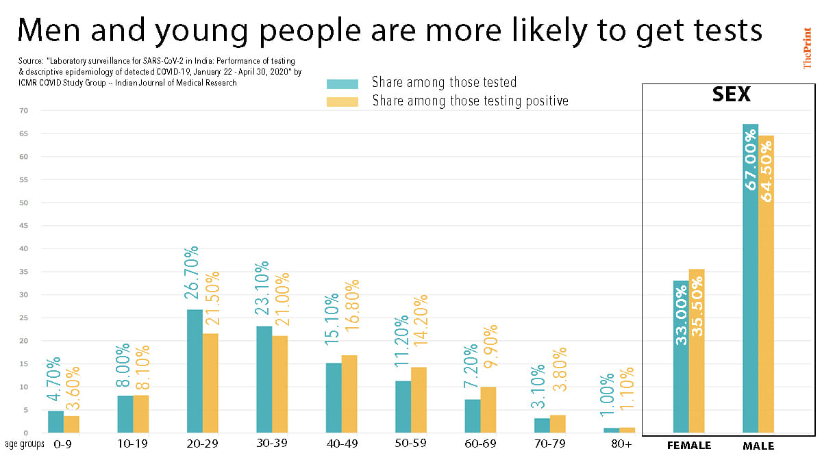 Even though men and younger age groups are more affected by the pandemic in India, younger people and men are slightly more likely to get tested than they are to test positive.