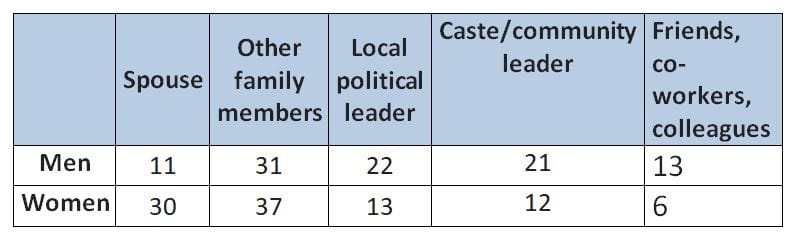 In the national election study 2014, more than four out of ten women voters (44per cent) said that they consulted someone before deciding whom to vote for; the figure among men was much lower – 31 per cent. More importantly, there is a sharp difference in who men and women consult before voting. Women tend to mostly consider opinion within the household while men are relatively more likely to consult elites outside the household. In the survey, two-thirds (67 per cent) of women who consulted someone before voting, spoke to their spouse or other family members. In contrast, only 42 per cent men consulted people within the household. Further, a substantial proportion of men said that they spoke to local political leaders (24 per cent) or caste leaders (21 per cent). Women were less likely to directly consult these elites.